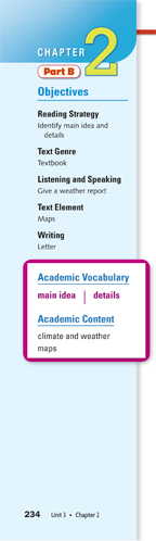 Each Chapter Part B section consistently presents Academic Vocabulary, Reading Strategy, Text Genre, and Text Element in conjunction with a reading passage.