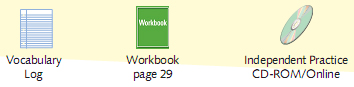 In this case, the students will add the new vocabulary words to their Vocabulary Log, do the Milestones Workbook with Test Preparation activities on page 29, and use the corresponding section of the Independent Practice CD-ROM.