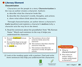 Instruction is followed by a sample activity. Students are then asked to apply what they have just learned by re-examining the reading.