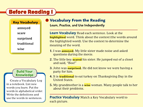 The following two student book pages provide further scaffolding for student success with the reading passage which follows.