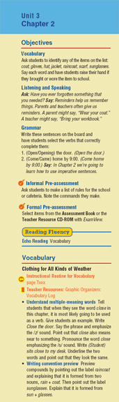 The Objectives provide a standards-based road map to what is going to be accomplished in the Chapter and you are provided with specific notes on how to teach this section.